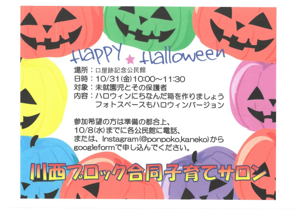 Happy💛Halloween (川西ブロック合同子育てサロン)お知らせ 2025年9月22日 最終更新日時 : 2025年9月22日 admin 10月31日(金)未就園児さん対象にハロウィンを開催します。 是非、ご参加下さい(^^)/