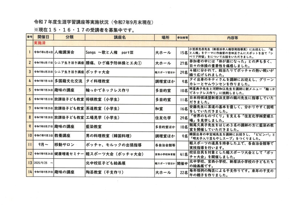 令和7年度の半分が終わりましたが、生涯学習講座等に多数のご参加ありがとうございます。