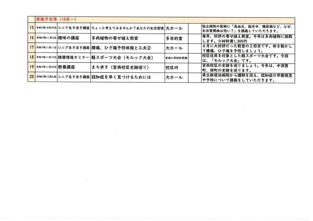 10月以降の予定、内容も掲載していますが、新たに、校区軽スポーツ(モルック)大会とまち歩き(宮西校区史跡巡り)の開催日が決定しました。