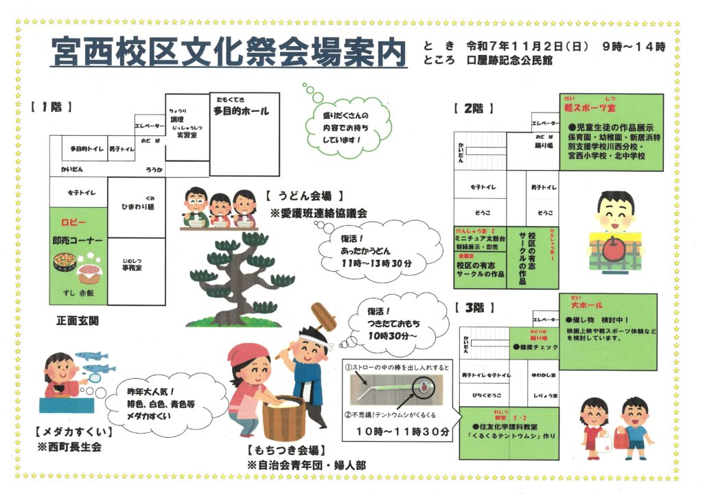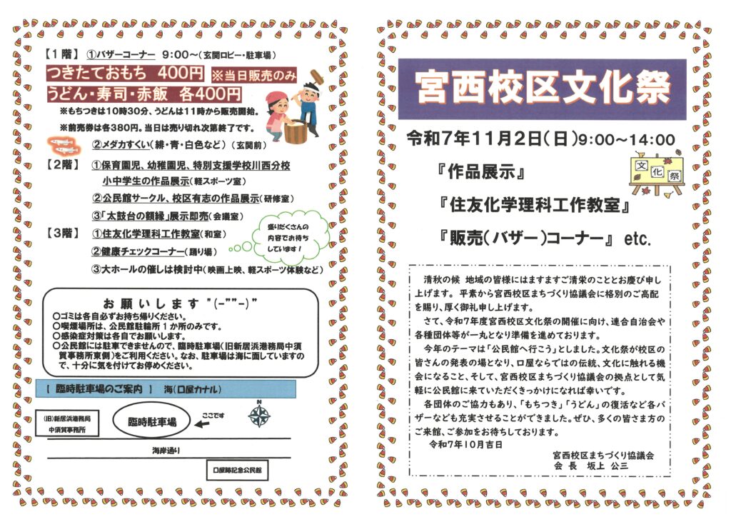 宮西校区文化祭のお知らせ 2025年9月29日 最終更新日時 : 2025年10月1日 admin 11月2日(日)宮西校区文化祭を開催します。令和元年以来6年ぶりに「うどん」「もちつき」が復活! ぜひ、ご近所お誘いあわせの上、ご参加下さい(^^)/