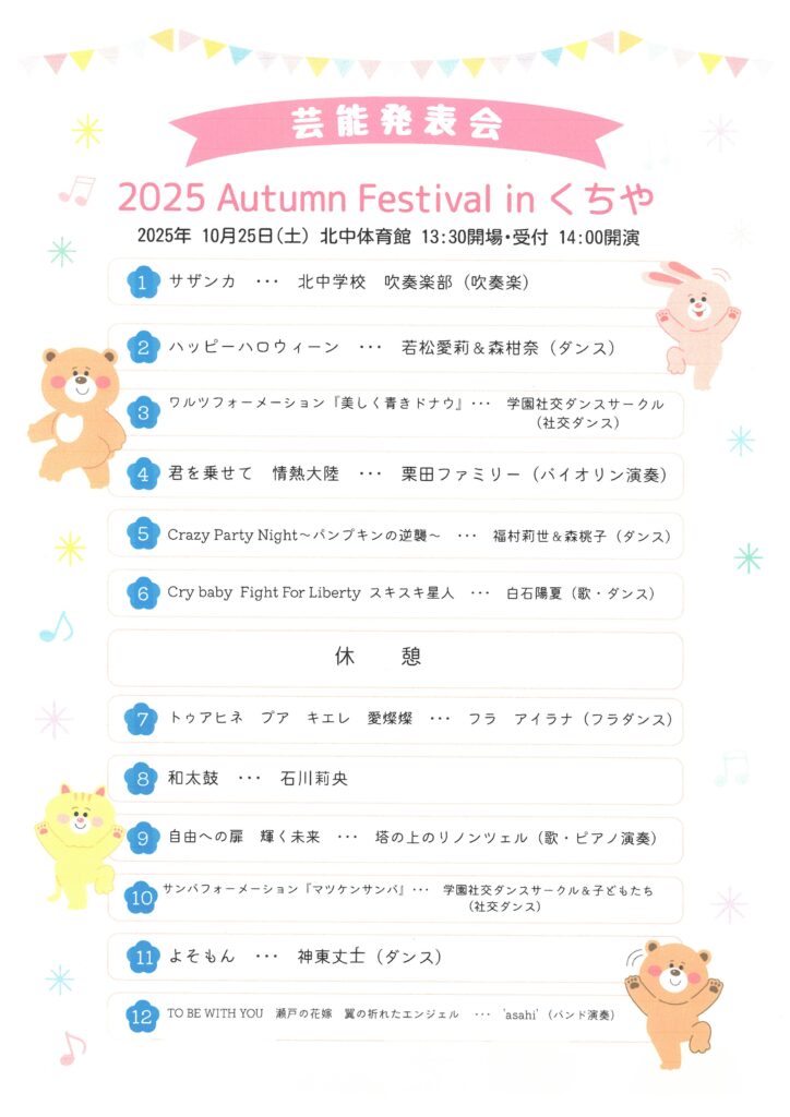 ♪Autumn Festival in くちや♪ 2025年10月24日 最終更新日時 : 2025年10月24日 admin 10月25日(土)北中学校体育館にて芸能発表会♪Autumn Festival ㏌ くちや♪ を開催します。 ぜひお越し下さい(^^)/