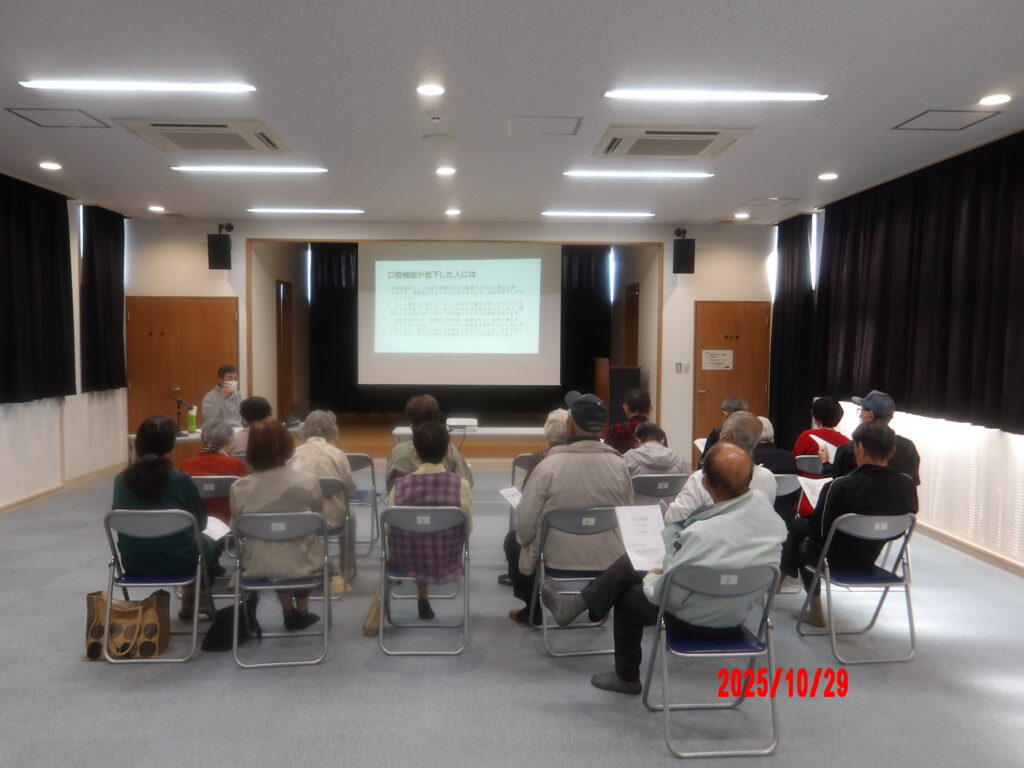 高齢者ができるだけ健やかに過ごすためには、先ずはフレイル(健康障害になりやすい状態)にならないことで、そのためには栄養(食事)、社会参加、身体活動(運動)が大切であることを、丁寧に、わかりやすく説明していただきました。