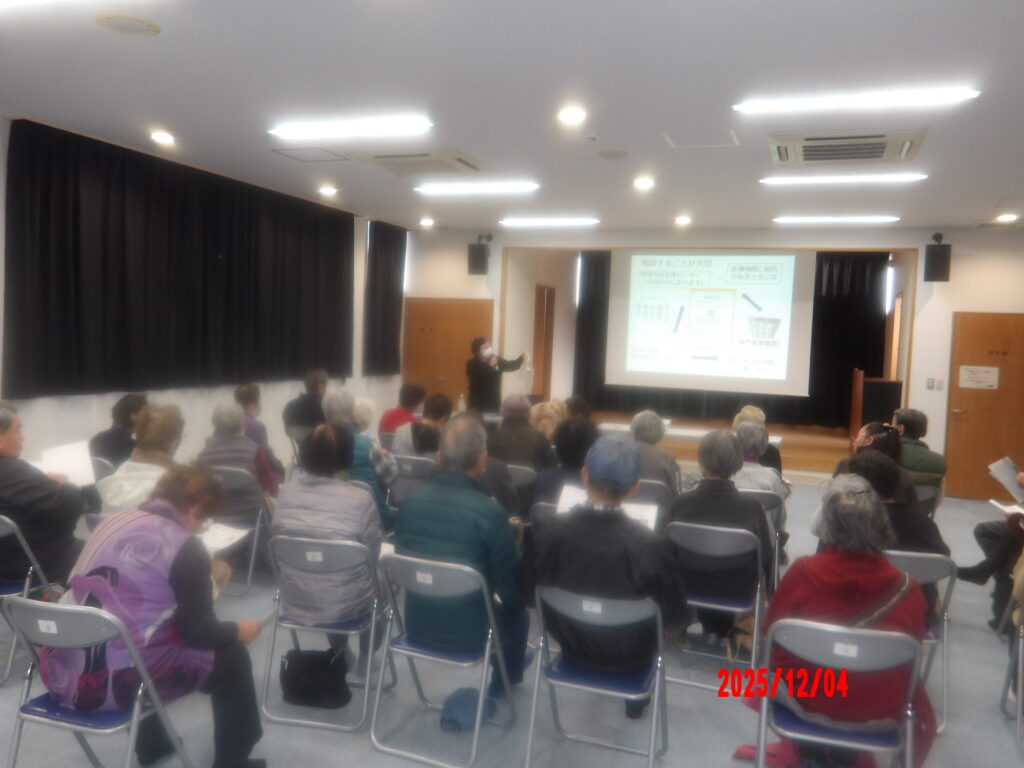 12月4日(木)県立新居浜病院で、『認知症看護認定看護師』として活躍されている真鍋光子専門員を講師にお迎えし、「認知症を早く見つけるためには」と題し、講義をしていただきました。今回は、34名と非常に多い参加者があり、認知症に対するシニアの関心の高さが伺えました。
