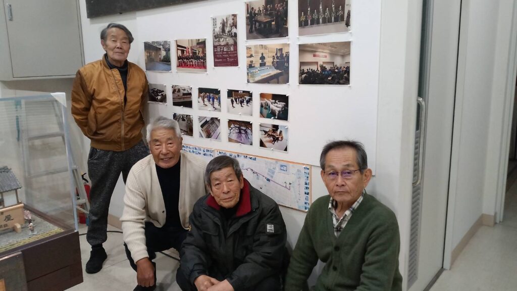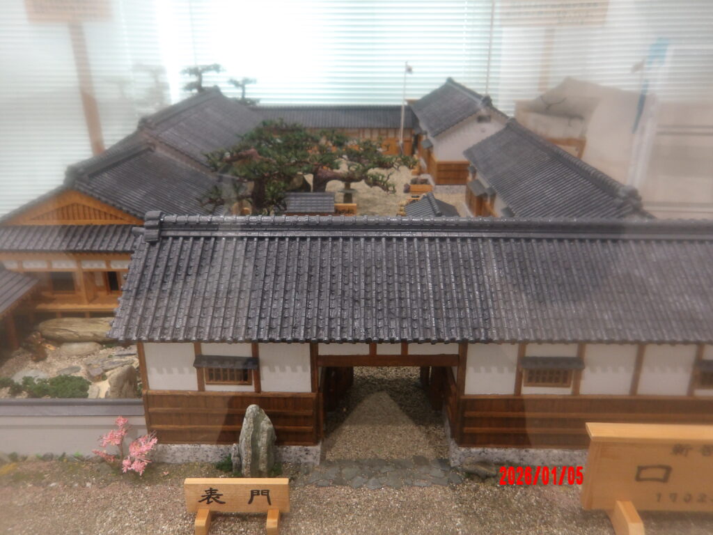 口屋跡記念公民館1階ロビーに展示されている3棟のジオラマ。これらは「口屋あかがねの会」の皆さんが2013年から2015年までに完成されたもので、1702年の開設当時を再現した「新居浜浦口屋浜宿」と「立川山村立川中宿」、そして1937年当時の「宮西小学校」を再現したものです。